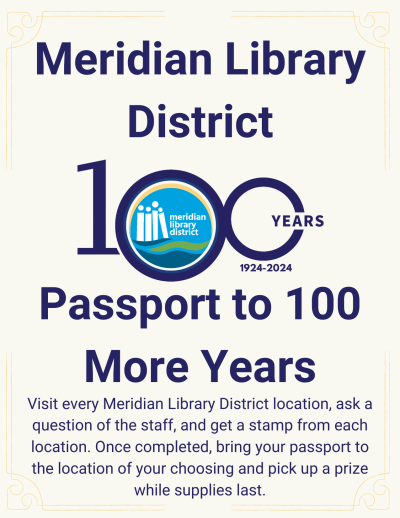As part of our Centennial Celebration, Meridian Library District (MLD) would like to announce our Centennial Passport Program! To participate, pick up a Centennial Passport at any MLD location, visit each location, ask a question of library staff*, receive a passport stamp at each location, and collect a prize once all stamps are completed! The program will go through October 31, 2024, or until supplies are gone.